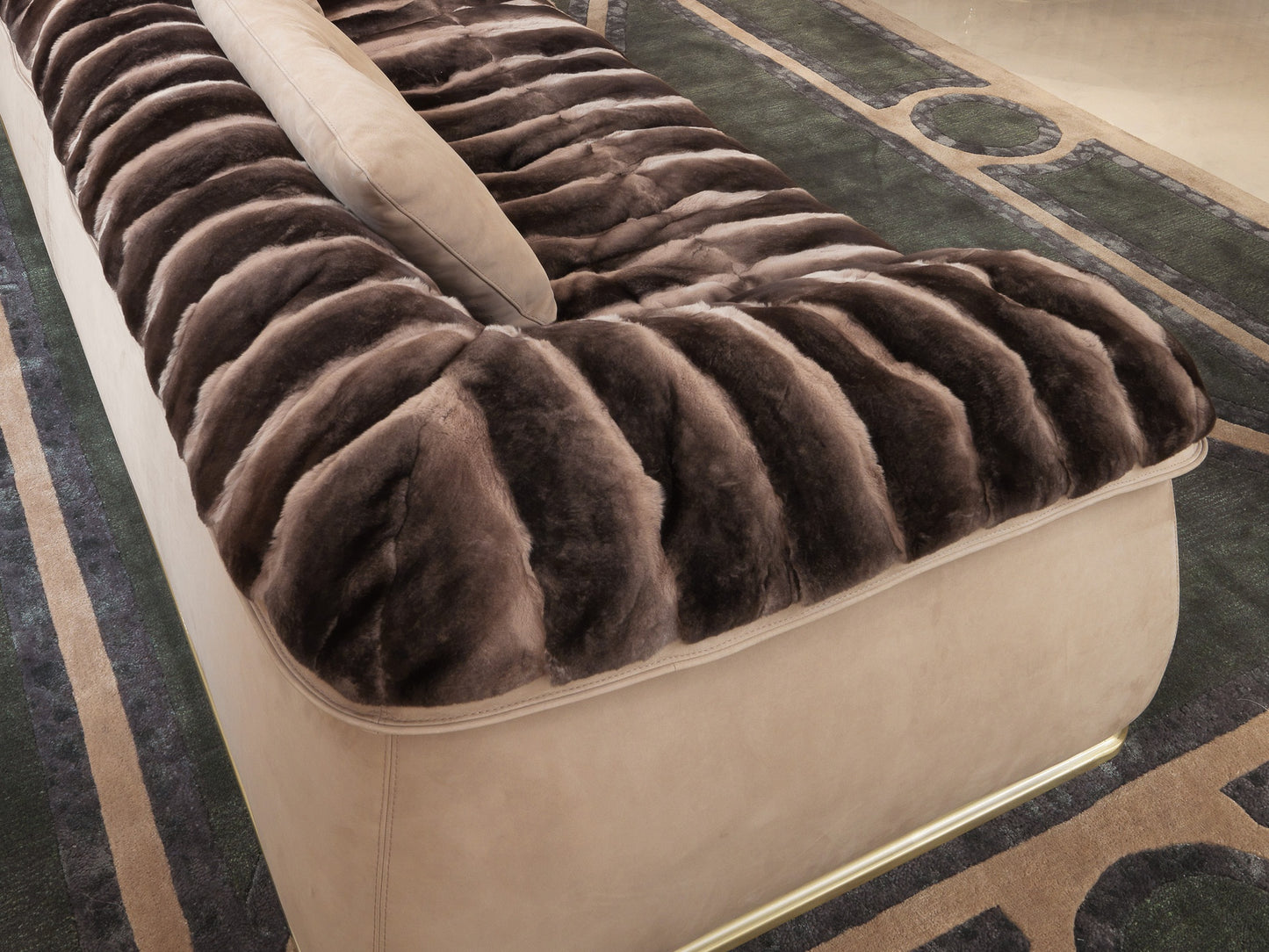 description | SOFA Main structure in solid pinewood and poplar plywood padded with extended polyurethane. Spring seat system with elastic belts. Body upholstery in leather or fabric. Reversible cover, lightly quilted with goose down and closed by a hidden zip. Plinth in moulded brushed aluminium. The fur coating is available in natural finishing on a gray or brown base or in dove-gray colour. Metal parts available in the satinized metal finishing selection. ARMCHAIR Main structure in moulded enamelled iron and metallic mail padded in expanded plyurethene. Seat spring system with elastic belts. Body upholstery in leather or fabric. Reversible cover, lightly quilted with goose down and closed by hidden frog. Legs in enamelled iron with conic shape. Finishing elements in turned and chromed aluminium. Visionnaire logos in chromed brass over the back legs. The fur coating is available in natural finishing on a gray or brown base or in dove-gray colour. Metal parts available in the sat-inized metal finishing selection. |