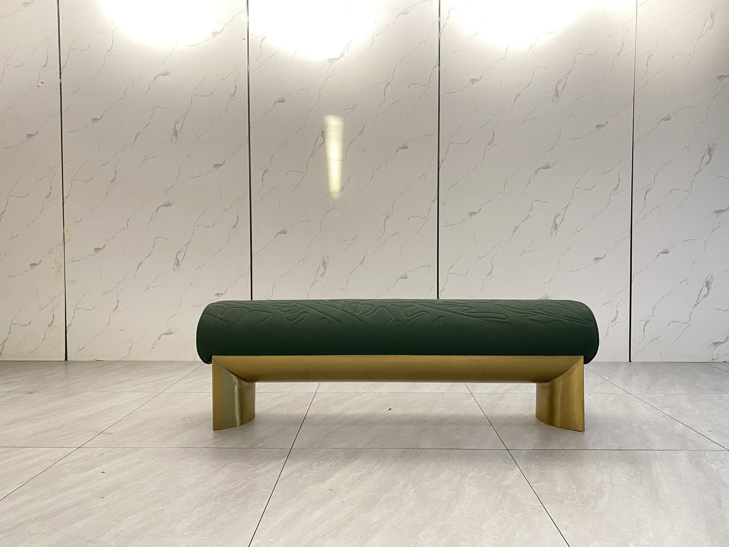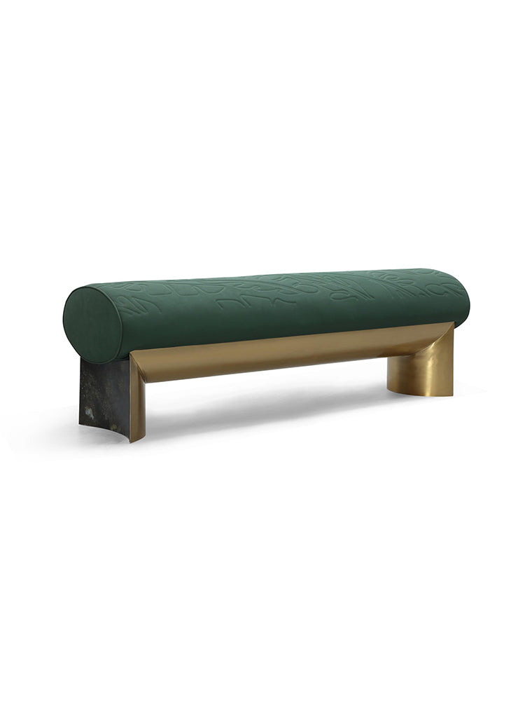 description | Upholstered bench with linear seat in leather or fabric, base covered in curved polished stainless steel, with concave-shaped solid marble side elements. Metal parts available in the metal finishing selection. The seat is also available in the “quilted” version in leather with embroidery with a slightly padded, foliage design. |