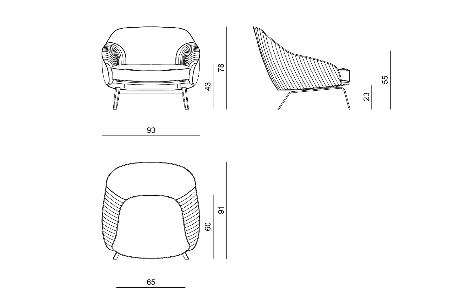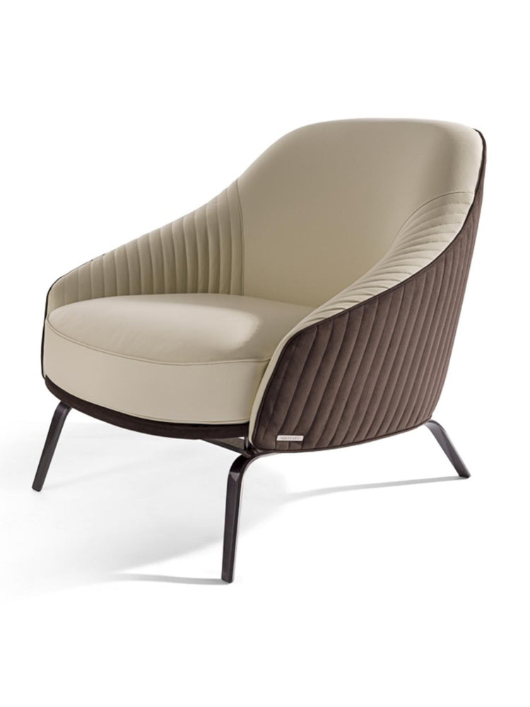 description | Armchair upholstered in leather or fabric, structure in curved plywood and solid wood equipped with elastic spring belts, padding in polyurethane foam with different densities , externally covered in leather or fabric with cannetté quilted decoration, seat and backrest in contrasting leather and fabric. Base structure in stainless steel available with any finish included in the metal finish selection. |