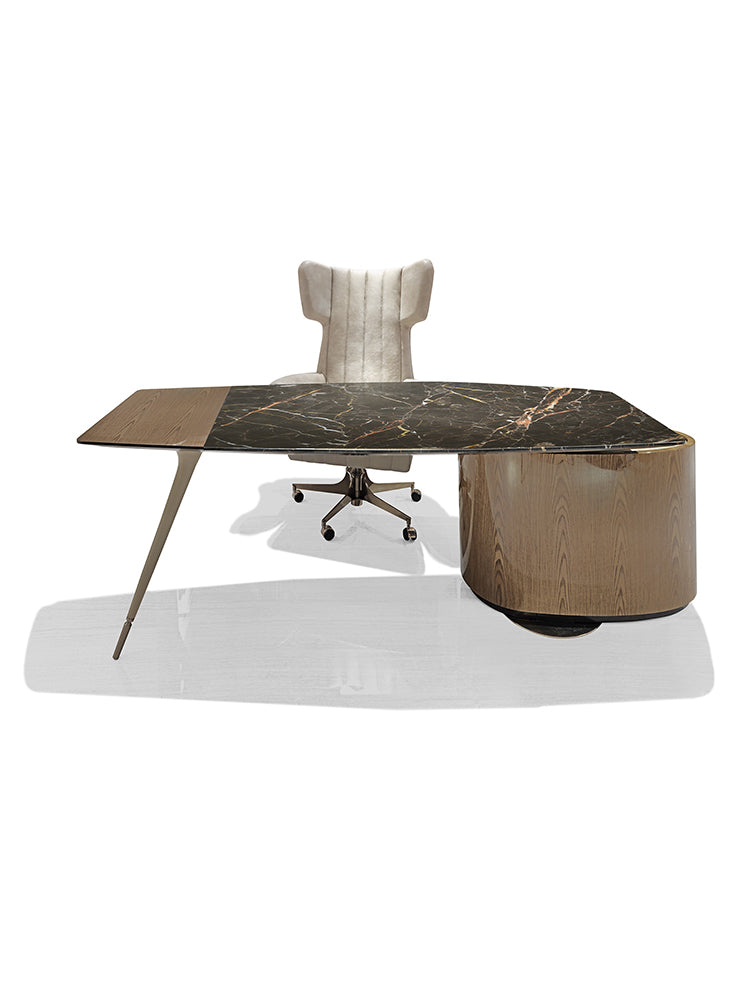 description | Writing desk in wood and marble with adjustable drawer unit. Drawer unit structure in curved plywood covered in veneer or lacqueres (RAL/NCS colours), with 3 drawers. Internal leg and profiles of the drawers in satinized stainless steel. Top in 2 layers in lacquered wood and shaped marble, with “negative” manufacture on edge, cable outlet, end part of the top in wood covered with veneer or lacquered (RAL/NCS colours). Side legs in “heel” shaped wood, manually coverd in leather, with tips in satinized stainless steel. Veneered parts available in the veneer selection finishings. Metal parts available in the satinized metal finishing selection. |