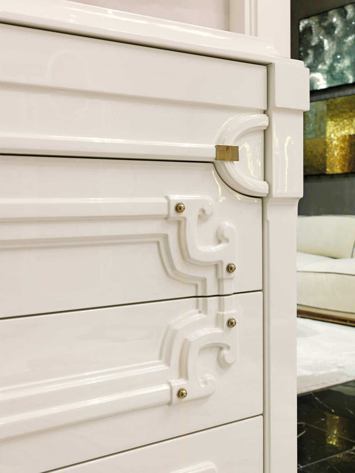 description | The structure is made of solid wood and glossy 100% lacquered MDF, with embossed decoration. Metallic chrome brass trimmings, studs and links. Decorative rings on the legs, made of laser-cut steel with aluminum and chrome. The cabinet interior spaces are brightly varnished, with 10 mm crystal shelves. Option: Oval patterned, carved 5mm mirror coated front. Joints, studs, logo, rings are also available gold/bronze lacquer. |