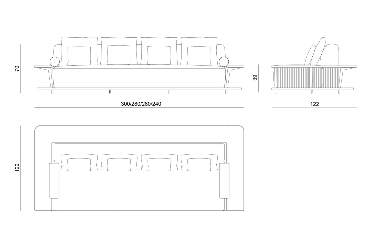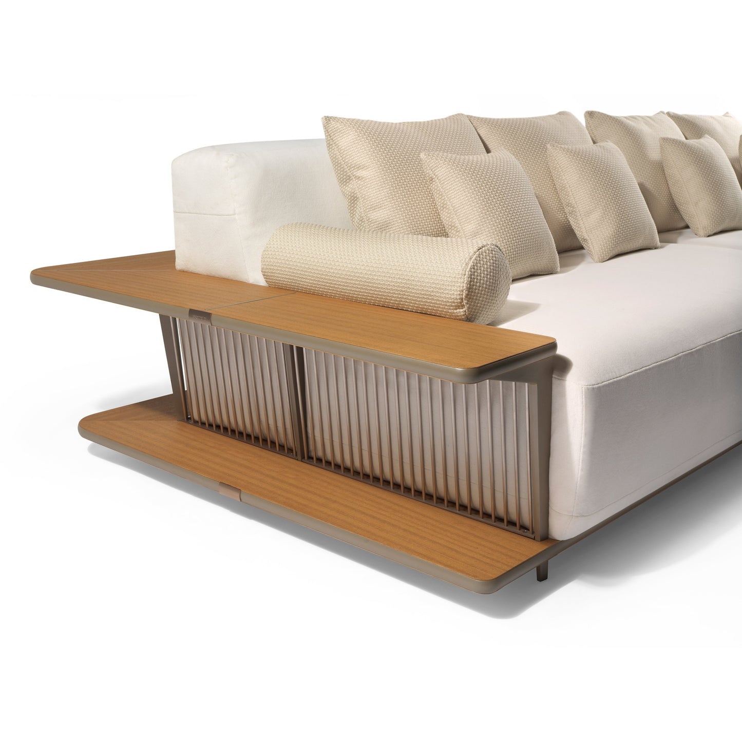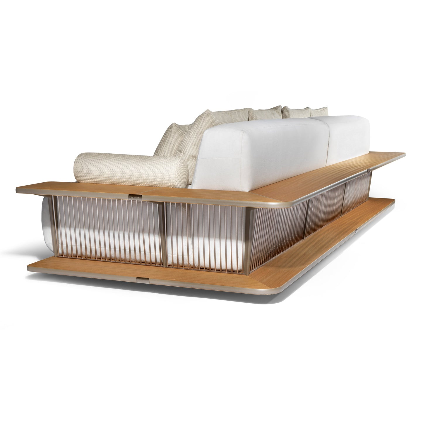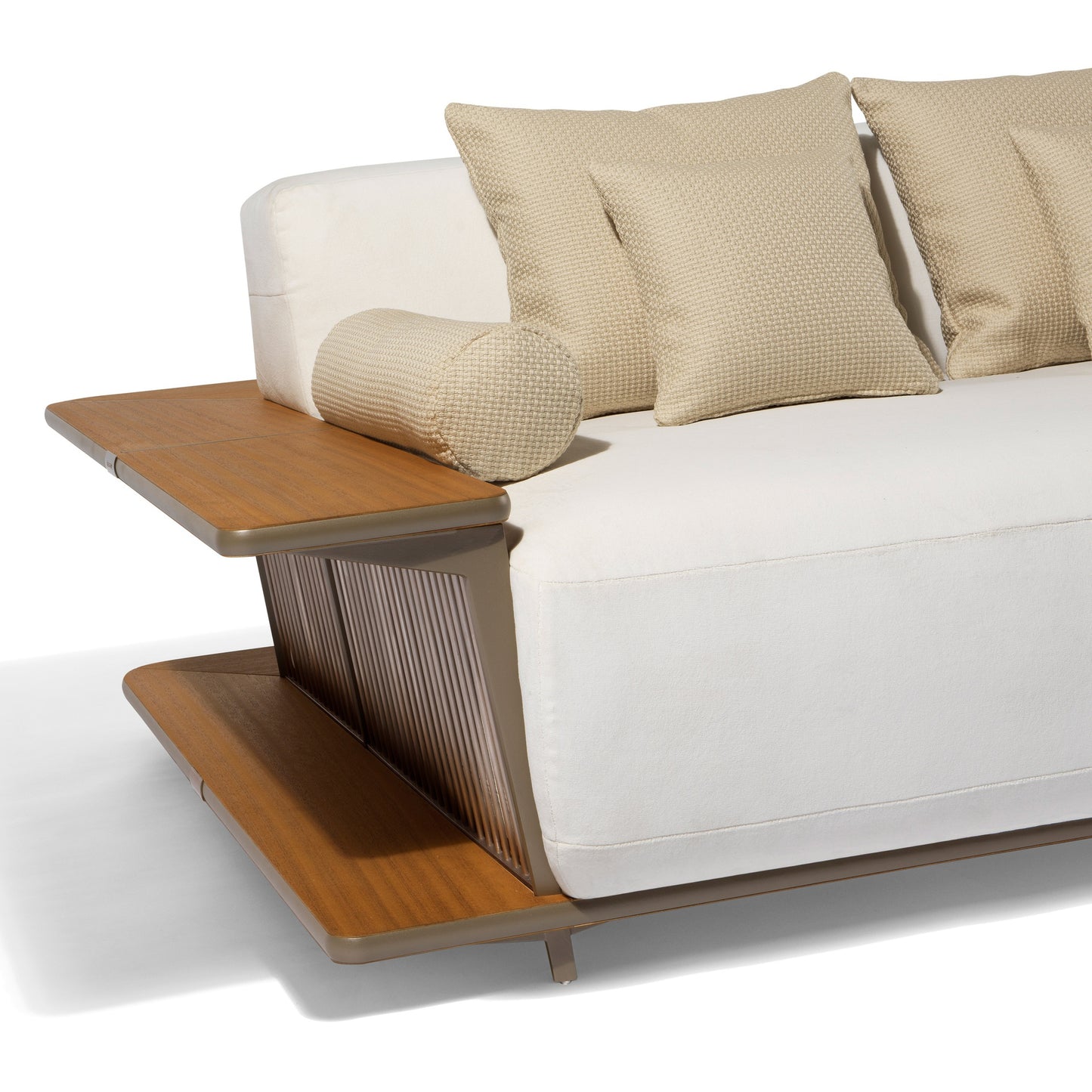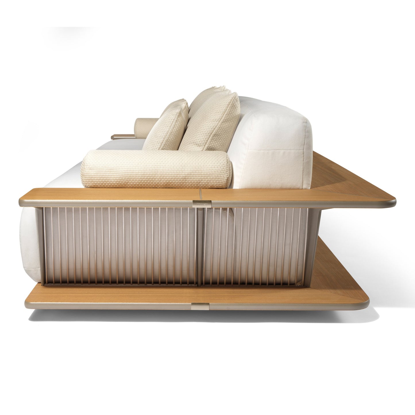 description | Sofa for indoor and outdoor use. Internal structure in plywood and phenolic boards, with base and external shelf in plywood finished with natural iroko veneer, decorated with a bulging aluminium profile, available in any of the powder coating in the outdoor metal finish selection, and buckles in solid brass, available in any lacquer of the polish metal finish selection. Padding in polyurethane foam with different densities and acrylic fiber, covered by a waterproof film and upholstered in fabric or leather from the Dehor collection of materials. The perimetral shelf is supported by legs in aluminium cast, available in any of the powder coating in the outdoor metal finish selection, and equipped with a decorative netting in aluminium, available in any of the powder coating in the outdoor metal finish selection or in any lacquer of the satin metal finish selection. Solid wood parts are finished with a mat isolating lacquer suitable for outdoor products. |