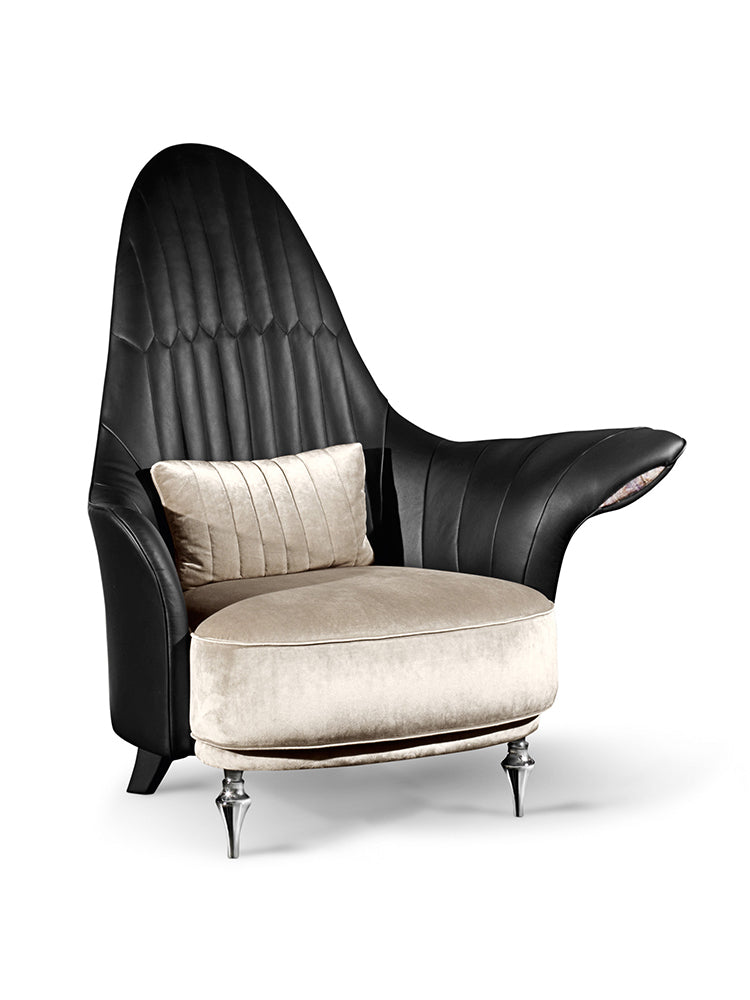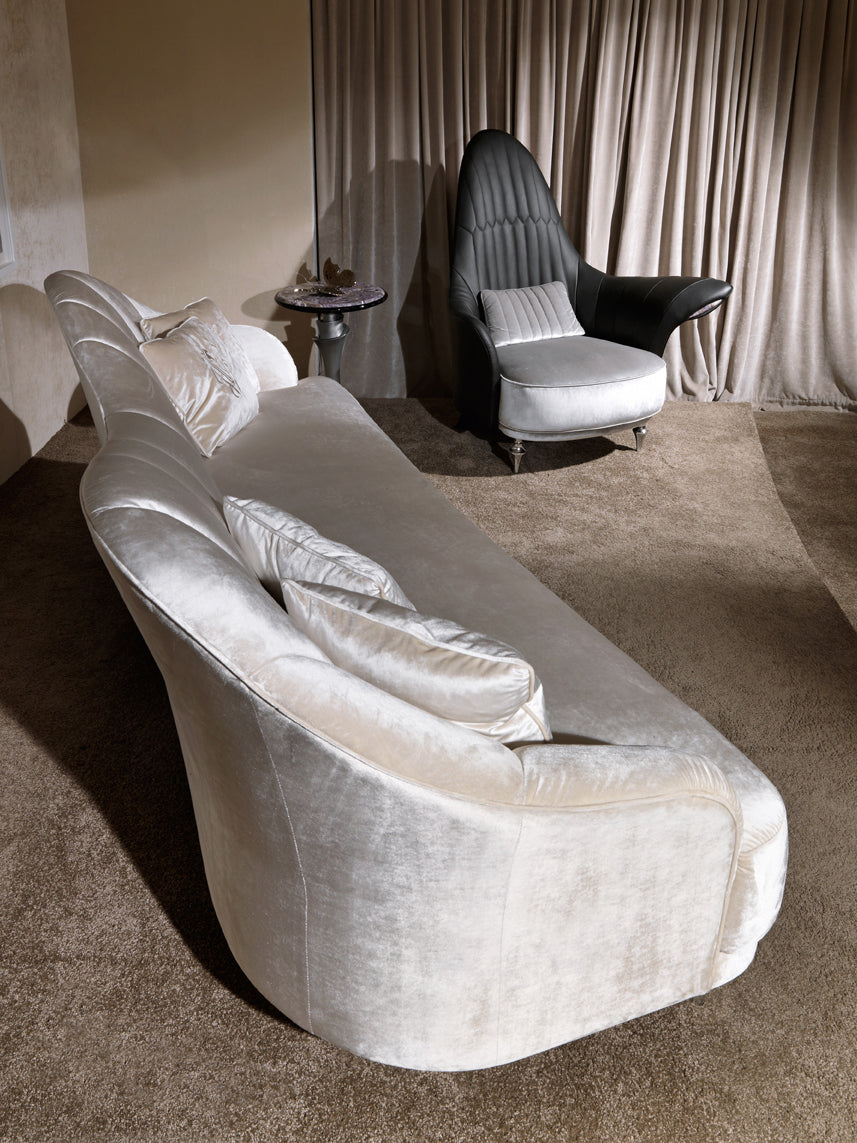 description | Structure in plywood and in solid wood, polyurethane foam in different densities Memory Foam® and acrylic fibre padding, backrest upholstery with capitonné rhombus pattern and seat cushion with light quilting. Back cushion in goose down, front feet in turned aluminium in chromed/golden/bronzed finishing and rear feet covered with fabric or leather. Option: decorative insert in the armrest in semi-precious stone or briar wood/veneer. |