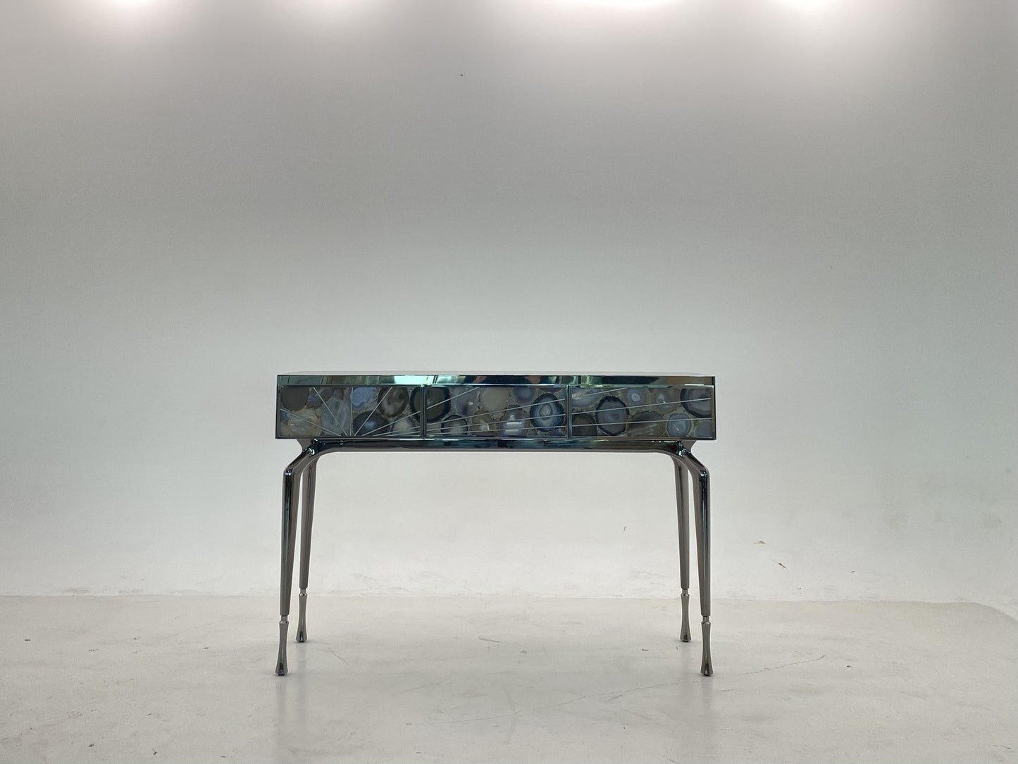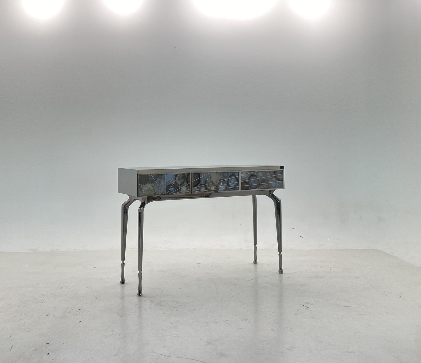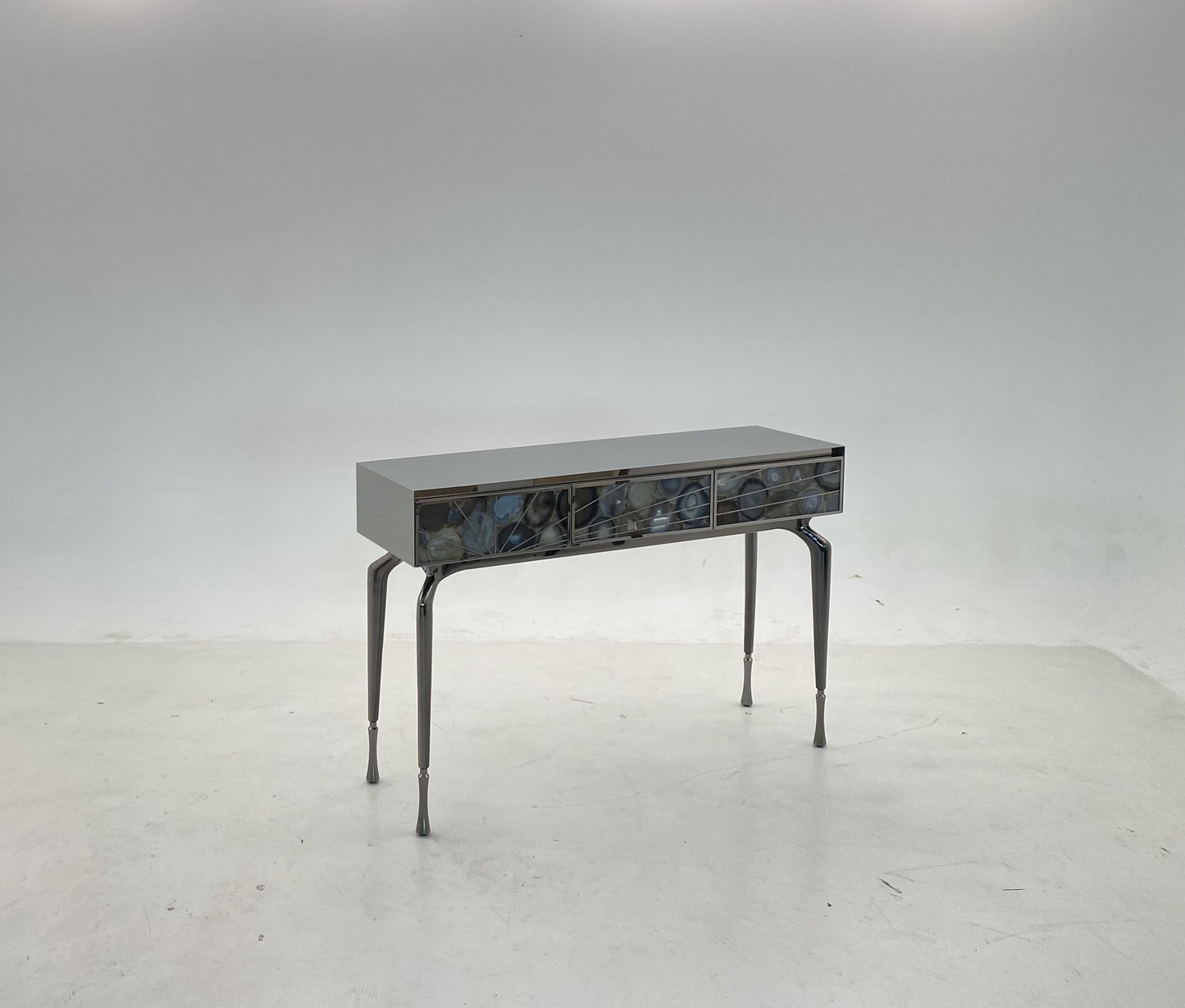 description | Wooden console with three drawers covered in brushed stainless steel, internal and back part in lacquered mat (RAL colours). Drawers covered in marble, framed and inlayed in stainless steel. The inlay design continues on the sides. Legs in polished aluminium cast with final tips in brushed aluminium. All metal details are available in gold, bronze or black nickel finishing. |