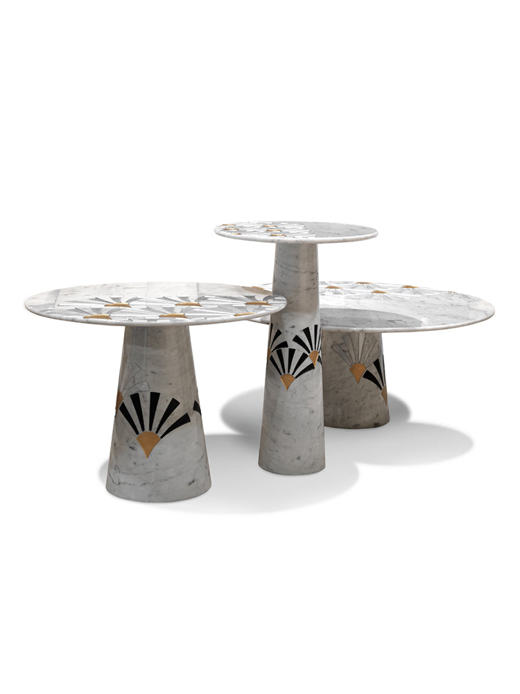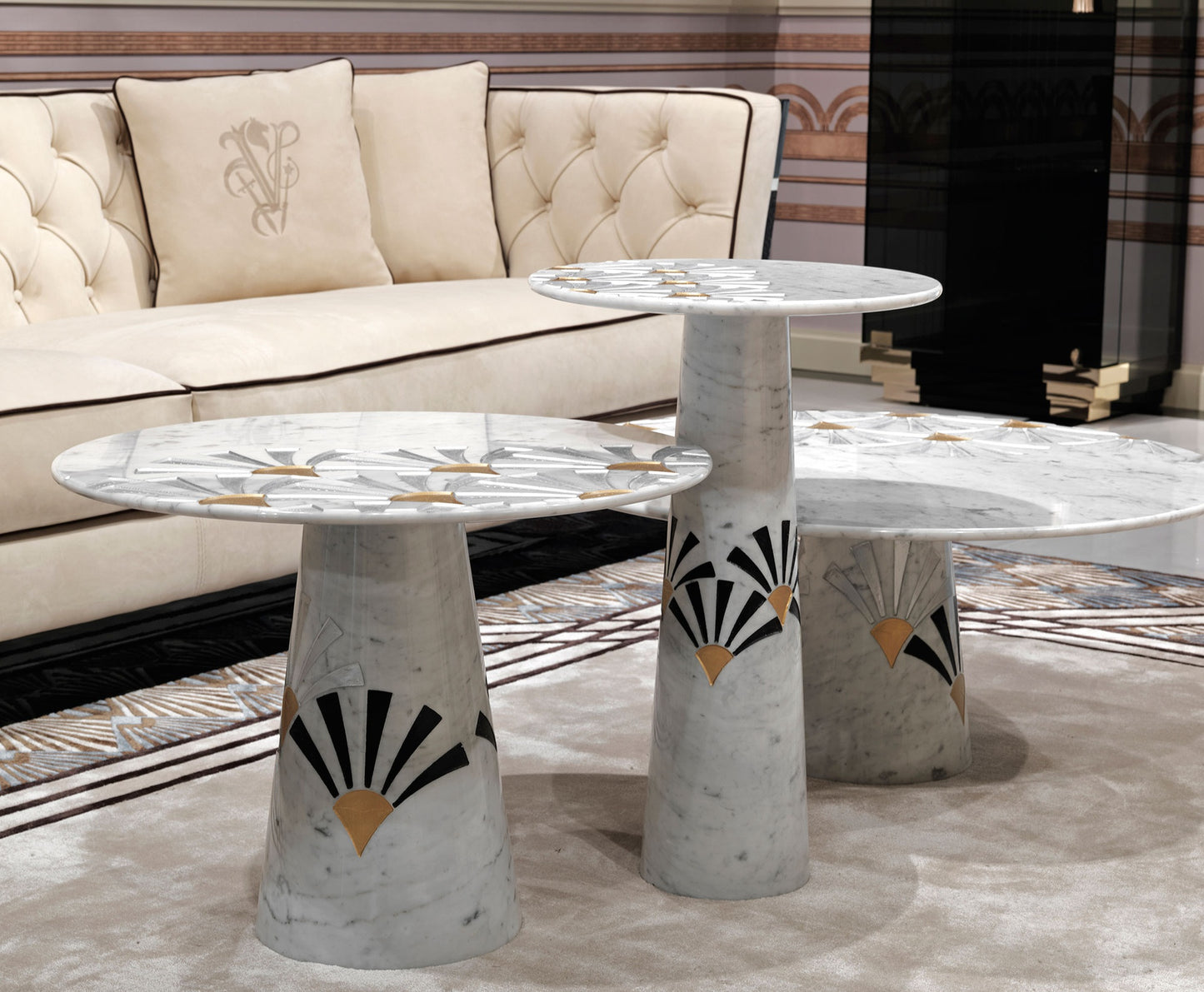 description | Low table in marble, top slab with engraved and hand painted decora- tions in bas-relief. Negative bevelled edge. Base in solid conical shaped marble with carved in bas-relief and hand painted decorations. Available in marble Bianco Carrara with fan or rhombuses engraving, or in Nero Marquina with fan or rhombuses engraving. |