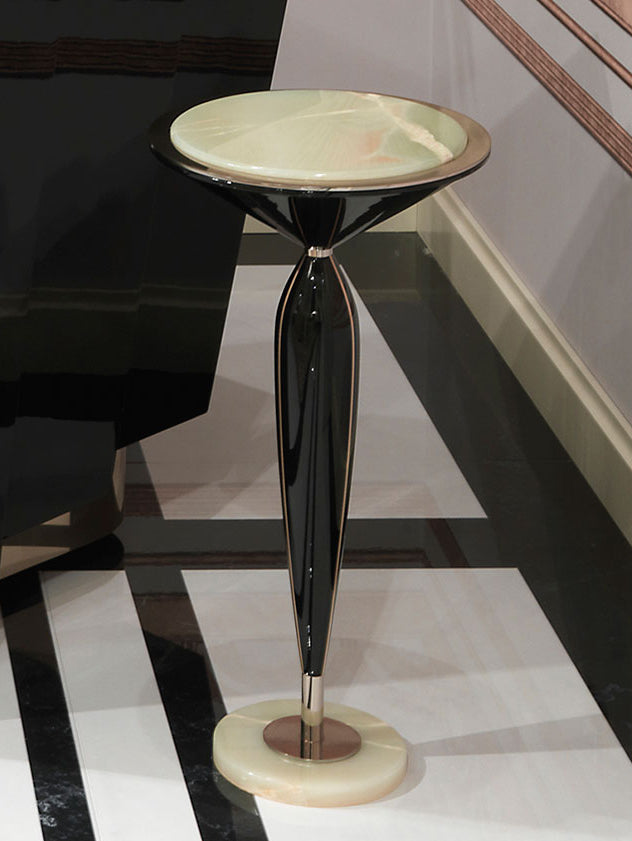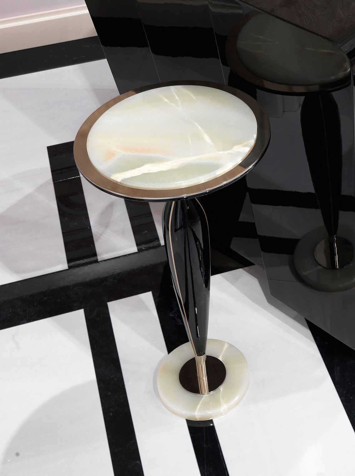description | Structure in lacquered and polished 100 gloss MDF (RAL/NCS colours) with vertical inserts on natural brass stem. Top edge and upper base in polished stainless steel, available in the metal finishing selection. Built-in top in bevelled marble, base in marble. |