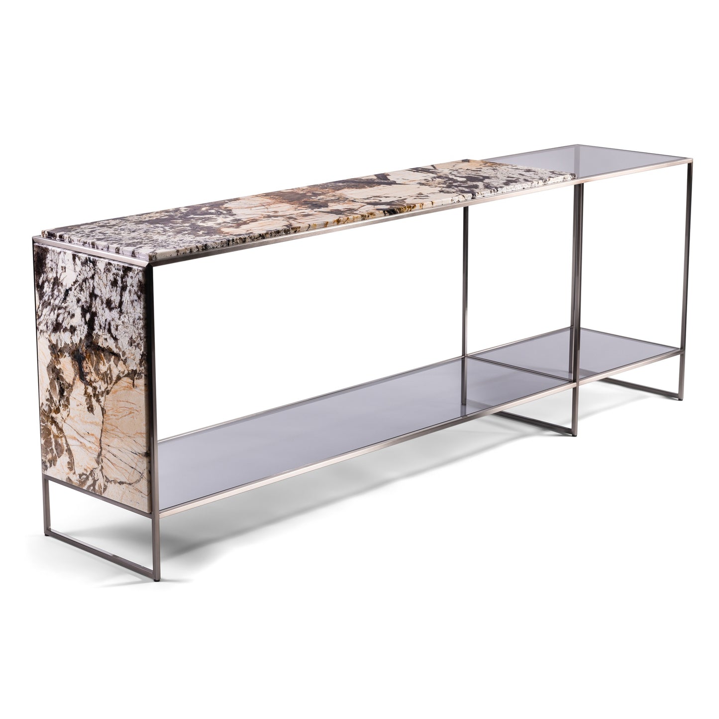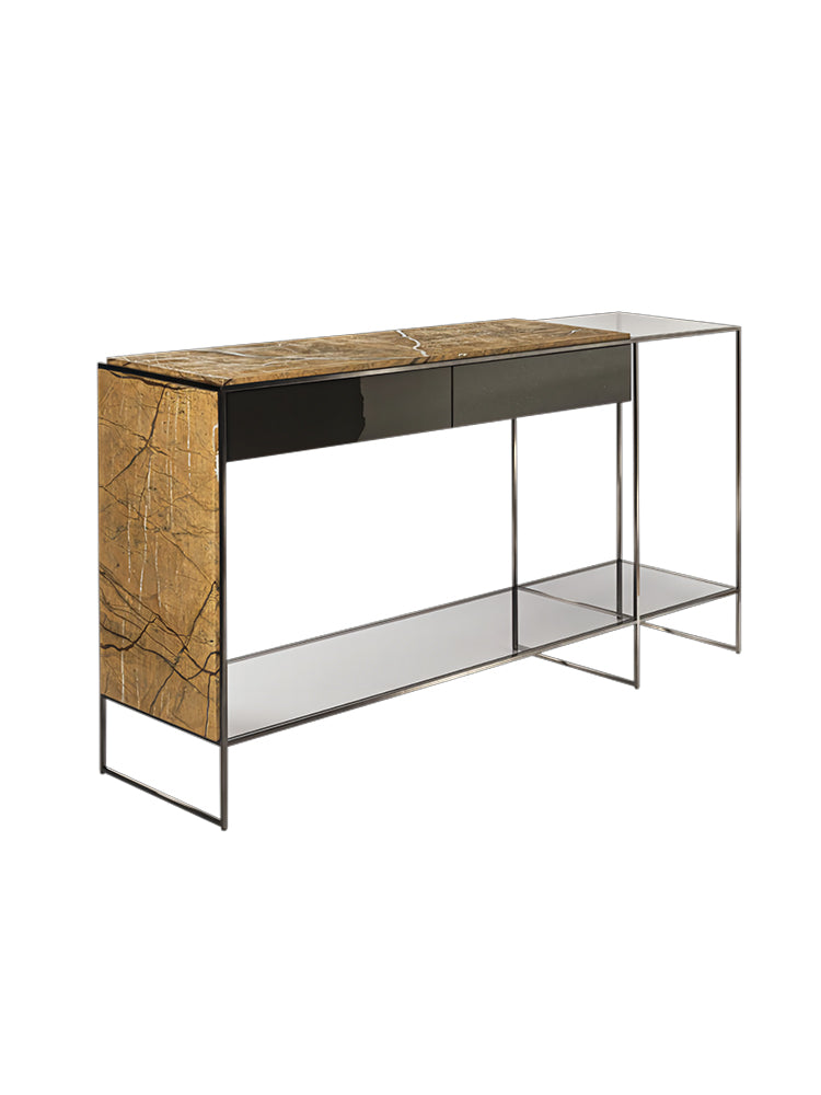description | Squared frame in satin steel with invisible welded joints, shelf in extra clear or smoked crystal glass. Top and side panel in vein-cut marble. Available in high version with two drawers in polish lacquered wood (RAL/NCS colour). Wall fixing. Metal details can be finished with any lacquer of the metal lacquer finish selection. Top in marble Rain- forest can be finished also with Linfa decorative micro-reflied engraving, with manual processing by Diego Crestani. |
